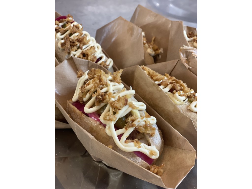 Uvnitř pomalu pečený bůček na česneku, krásně šťavnatý a voňavý, k tomu jemně štiplavý křen, dijonská majonéza, křupavá okurka a piklovaná cibule, která to celé pěkně nakopne.