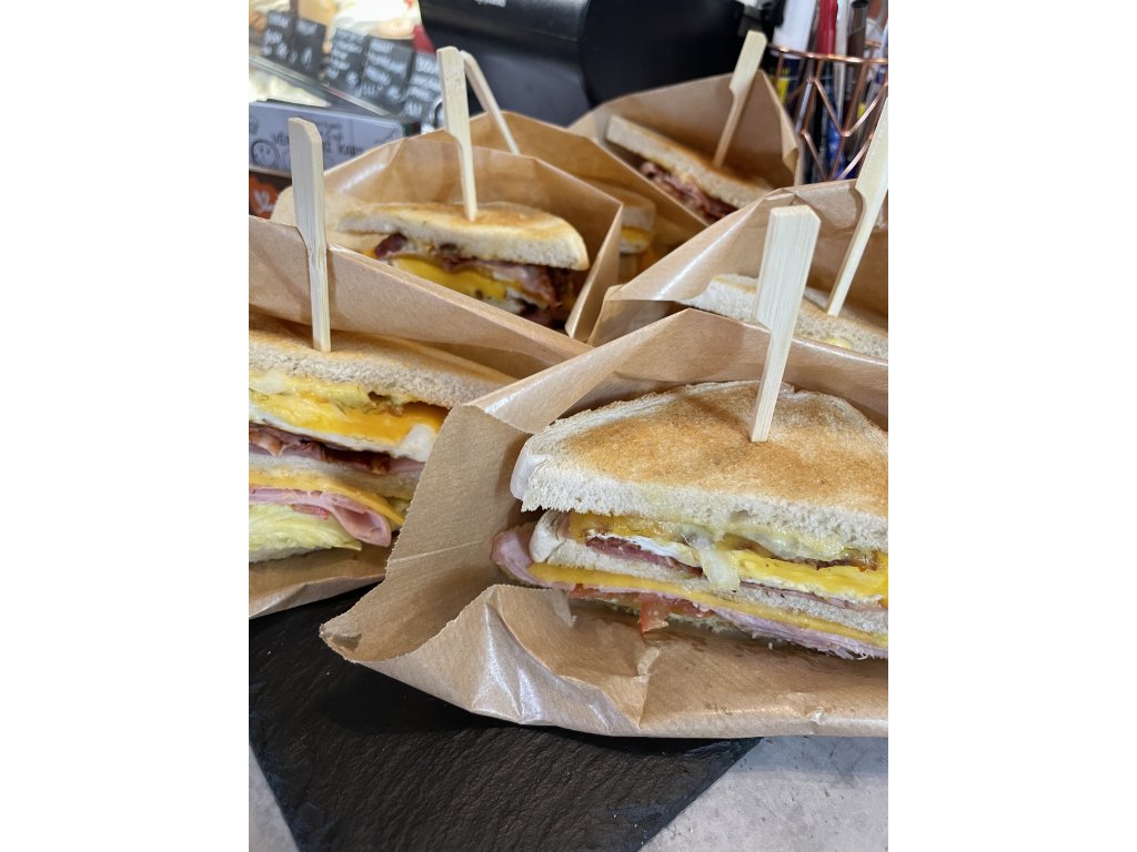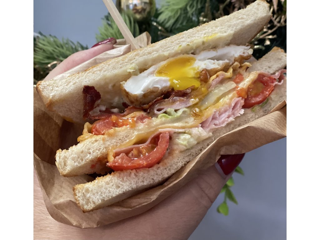 Poctivý opečený sendvič plněný šunkou, rozteklým čedarem, křupavou slaninou a vejcem, doplněný domácí tatarskou omáčkou. Ideální volba pro rychlý oběd, snídani nebo sváču.